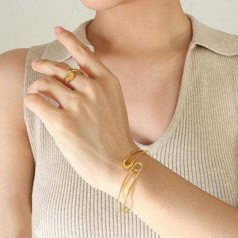 طقم سوار نسائي مفتوح فاخر من الفولاذ المقاوم للصدأ عيار 18, طقم سوار نسائي جديد من الفولاذ المقاوم للصدأ عيار 2022 على شكل دبوسين فاخر من الذهب عيار 18 ، طقم سوار نسائي مفتوح من مجموعة مجوهرات