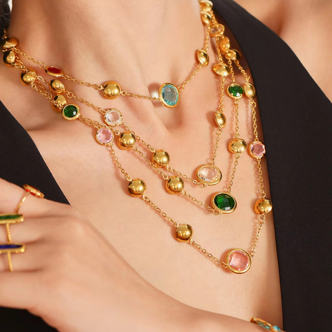 قلادة حجرية زجاجية مستوردة شفافة فائقة اللمعان من الفولاذ المقاوم للصدأ مجوهرات حفلات أنيقة أنيقة من المزاج للنساء